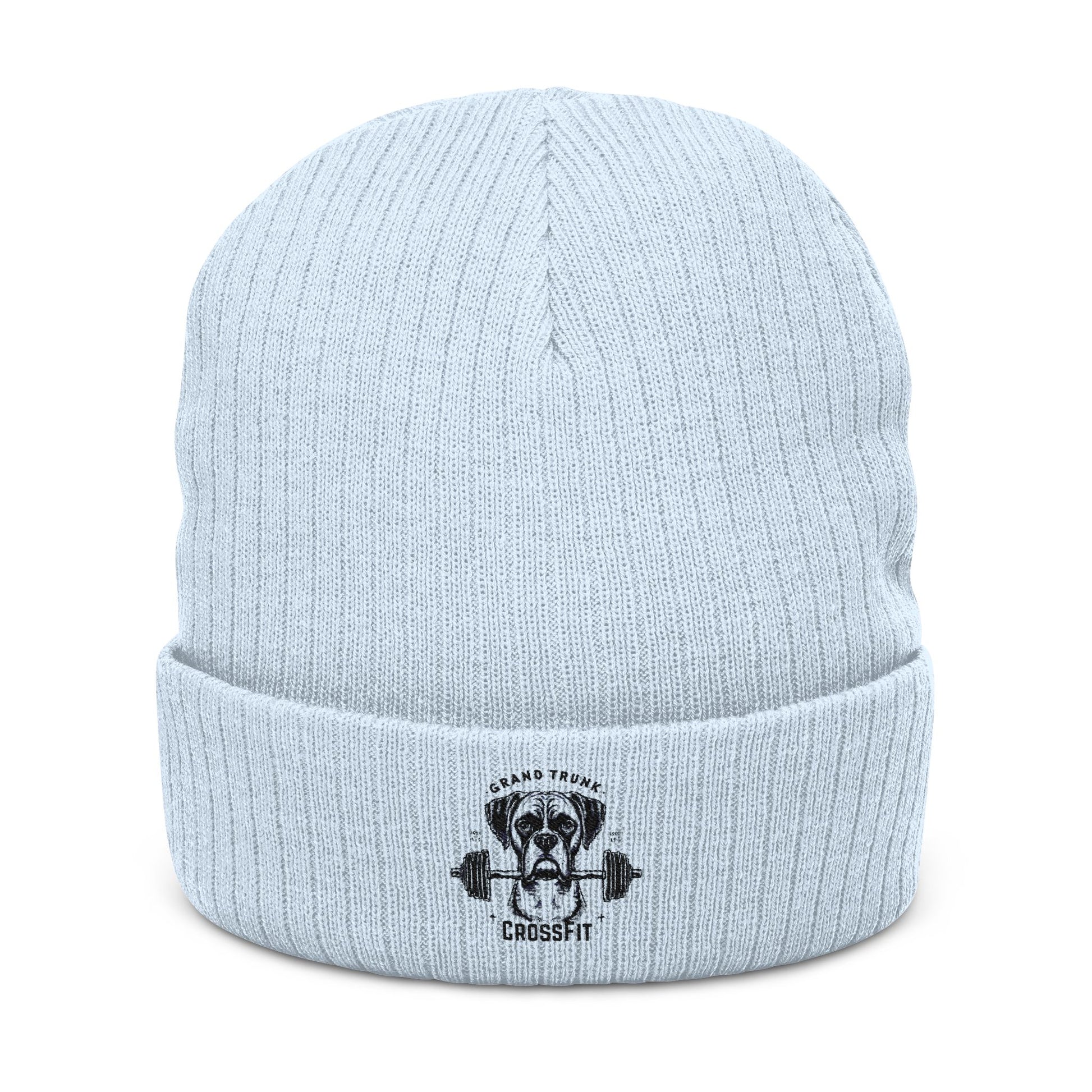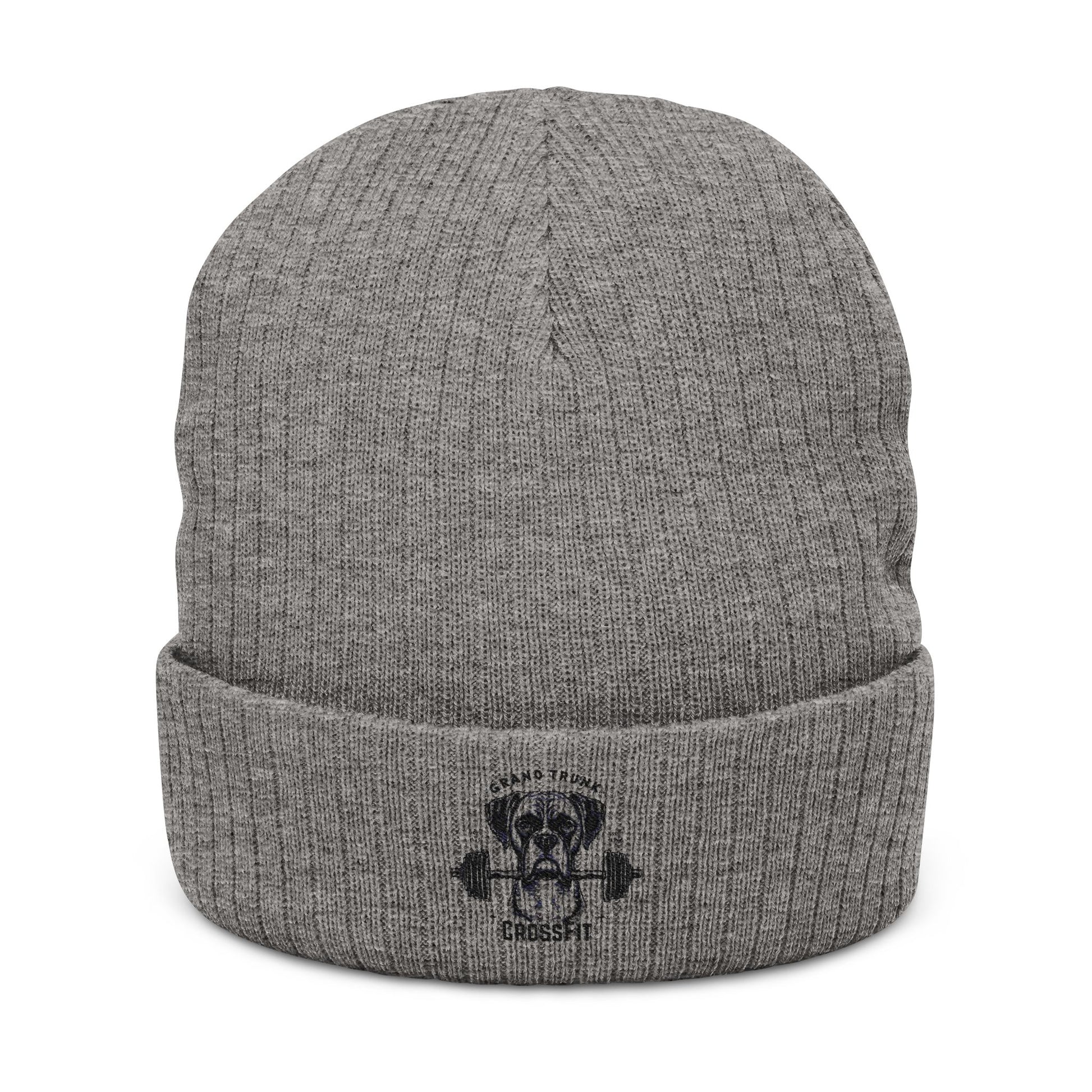 Embroidered Skull & Barbell Ribbed Knit Beanie — Fitness Gym Skull Cuffed Hat